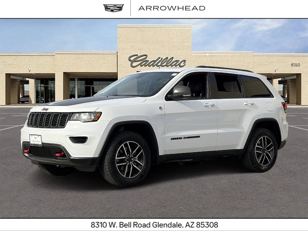 The bright white clearcoat exterior, complemented by a sun/moonroof and rear spoiler, exudes a commanding presence. With its tow hooks and hitch, the Grand Cherokee Trailhawk is ready to tackle any adventure you throw its way, making it the perfect companion for the discerning driver.